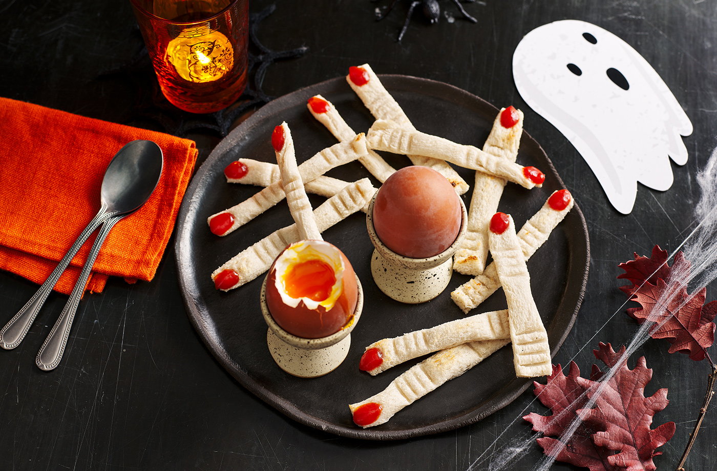 4. Tedd a kenyérujjakat egy serpenyőbe, és pirítsd 2–3 percig, amíg világos aranyszínűek lesznek. Nyomj egy kis ketchupot az ujjvégekre, hogy „vérző” hatást kapjanak, és tálald őket a főtt tojásokkal.
