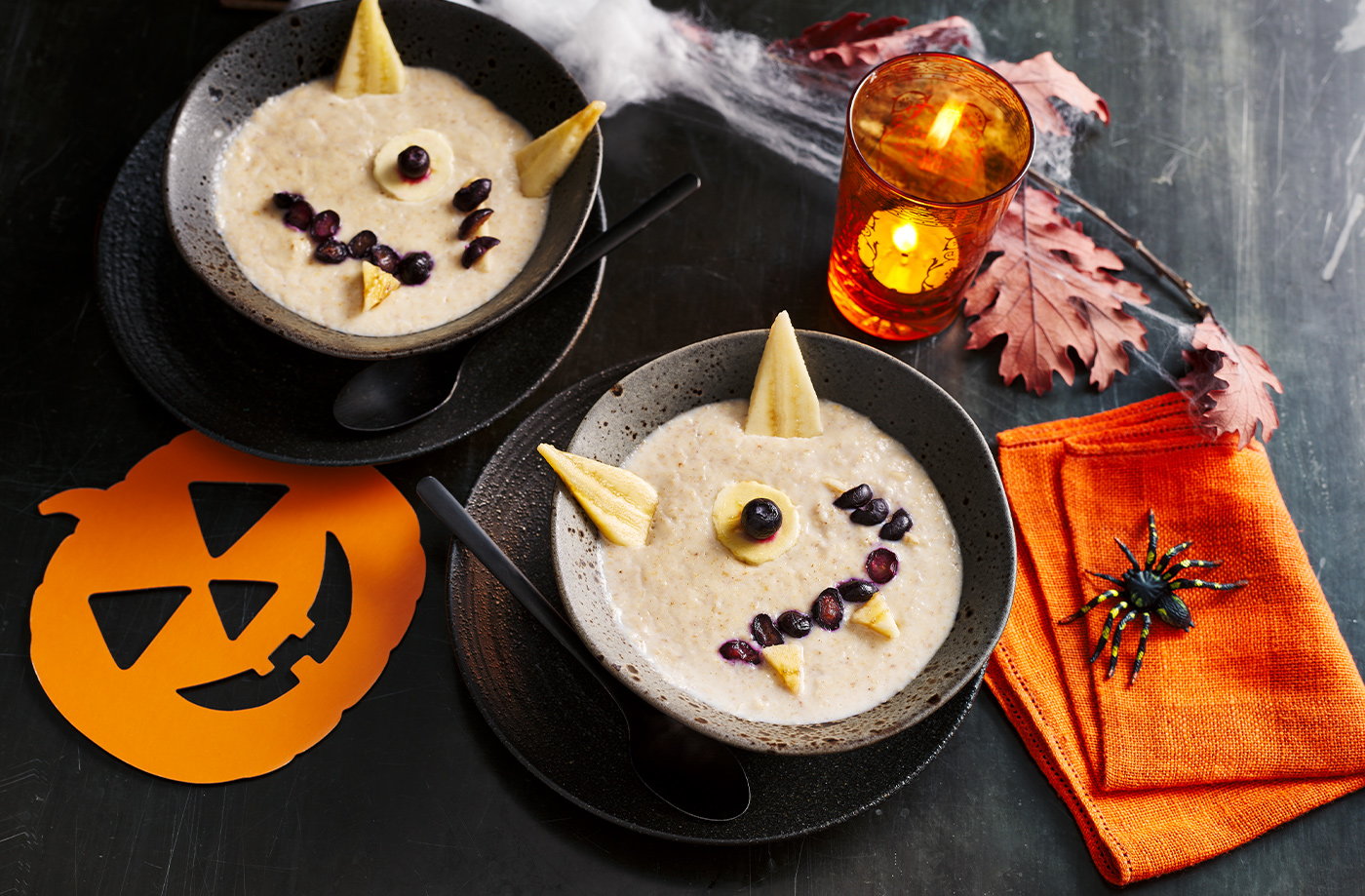 Ez a Halloween-tematikájú zabkása inkább aranyos, mint ijesztő – a gyümölcsökből készült „heges” szörnyarc garantáltan mosolyt csal majd mindenki arcára!