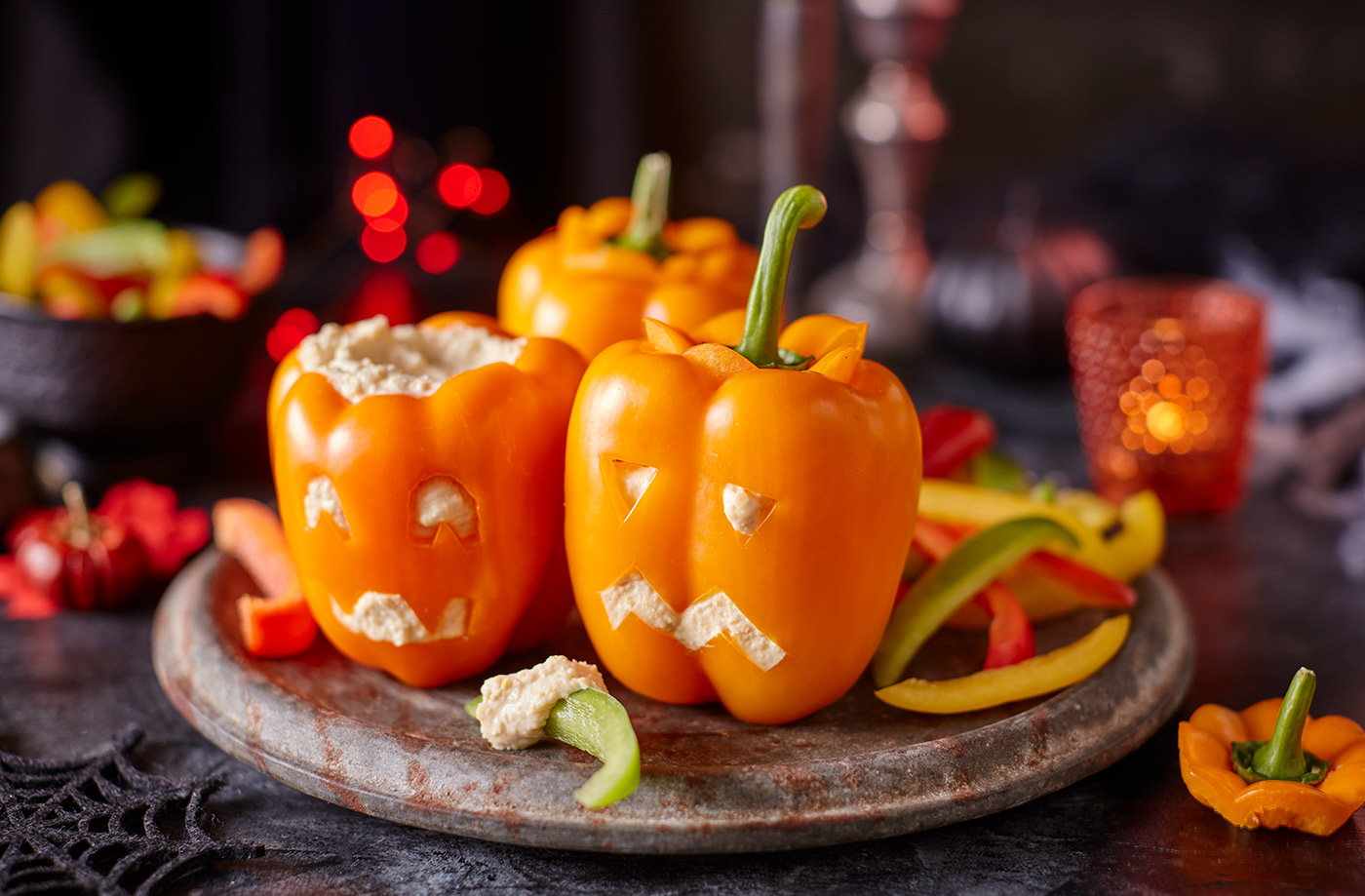 Készíts gyorsan és egyszerűen egy szuper Halloween-nasit, amit imádni fognak a gyerekek és a felnőttek is! Mindössze három hozzávalóra lesz szükséged: narancsszínű paprikára, humuszra és néhány ropogós mártogatnivalóra.