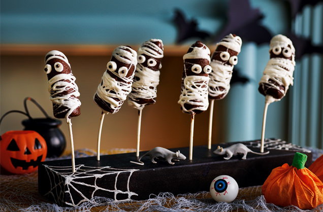 3. A maradék pillecukrokat mikrózd meg 20–30 másodpercig, amíg kissé megolvadnak. Hagyd hűlni pár percig, hogy nyúlós, „pókhálós” szálakat kapj, majd egy villával tekerd körbe vele a banánokat – így lesznek igazi múmiák!