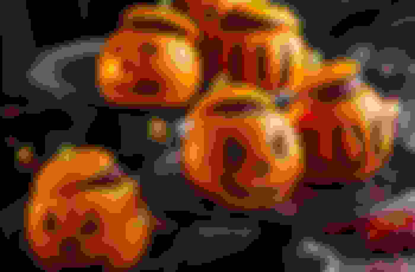 2. Egy kis, éles késsel vágj „szörnyes” vagy „lámpás” arcokat a paprikák oldalába. Ha szükséges, vágj le egy keveset az aljukból, hogy egyenesen megálljanak (vigyázz, ne vágd át teljesen).