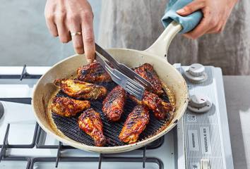 Süsd meg a szárnyakat Tedd át a szárnyakat a grillsütőre (vagy serpenyőre). A grillsütő vagy a serpenyő méretétől függően több adagban süsd. Ha grillsütőt használsz, helyezd a húst a külső részre. Süsd 5-8 percig, 1-2 percenként megforgatva, és kenegesd meg a mázzal, amíg megpirul. Tegyél 2 félbevágott citromot a serpenyőbe, vágott felükkel lefelé, és süsd 3 percig.