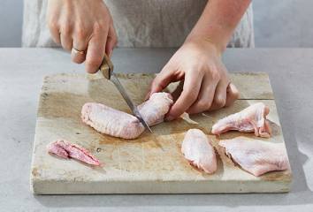 Szárnyak előkészítése Először válaszd szét a szárnyakat, hogy később gyorsabban átsüljenek. Távolítsd el egy éles késsel az ízületek közötti „végeket”, hogy két „szárnyrészt” kapj. Tapintsd ki az ízületet az ujjaiddal, hogy tudd, hol kell vágni. A késnek könnyen kell átvágnia a csontok közötti részt! Itasd fel a nedvességet a szárnyakról egy konyhai papírtörlővel. Melegítsd elő a sütőt: gázsütőt 6-os fokozatra, 200°C-ra, légkeveréses sütőt pedig 180°C-ra.