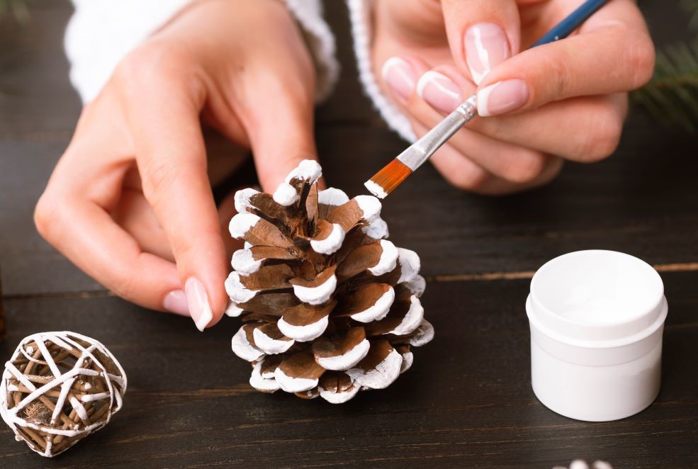 A kirándulások során gyűjtsünk össze 15-20 tobozt az erdőből. Válasszunk nyílt tobozokat, hogy könnyen hozzáférhessünk a pikkelylevelekhez. Ezek belső részét kenjük be ragasztóval egy vékony ecset segítségével, majd illesszünk be különféle színű apró gyöngyöket. Miután megszáradt a ragasztó, a pikkelylevelek végét fessük le fehér festékkel, mintha hó hullott volna rá. Egy közepes varrótű segítségével szúrjuk át a toboz törzsét annak alján és húzzunk egy egy 20 centis cérnát, amelyből hurkot formálunk. Ha megszáradt a festék, a tobozok mehetnek fel a fenyőfánkra.