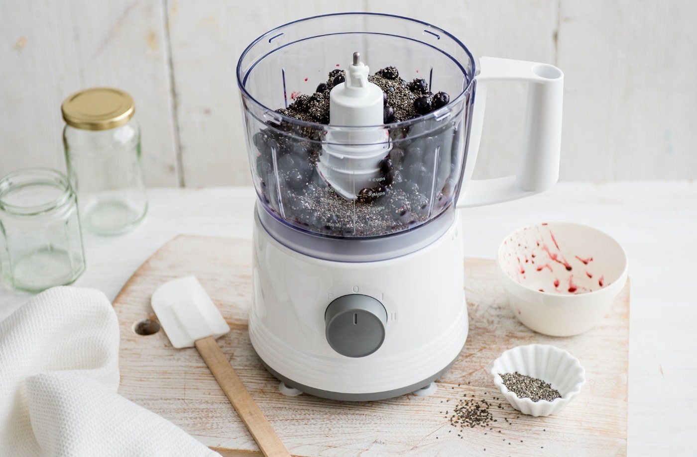 Vegyünk ki a fagyasztóból egy 350 g-os csomag fagyasztott áfonyát, hagyjuk 5 percig olvadni, majd tegyük a turmixgépbe 30 g chia maggal együtt.