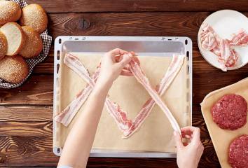 Tegyük a bacon szeleteket a tepsire úgy, hogy X-et formázzanak.
