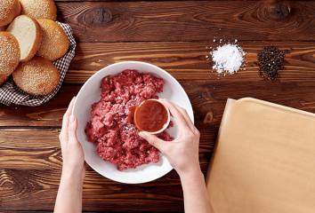 Melegítsük elő a sütőt 200 fokra. Egy tepsit takarjunk le sütőpapírral. Keverjük össze egy tálban a húst, a szószt, adjunk hozzá sót és borsot.