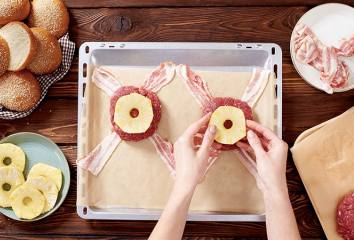 Tegyük a közepére a húst, "koronázzuk meg" egy szelet ananásszal.