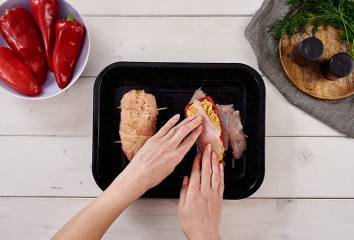 Helyezzük hosszában a paprikát a csirke közepére. Tekerjük fel a csirkét, rögzítsük fogpiszkálóval. Öntsünk némi olívaolajat egy serpenyőbe, tegyük rá a tekercseket és süssük 30-35 percig.