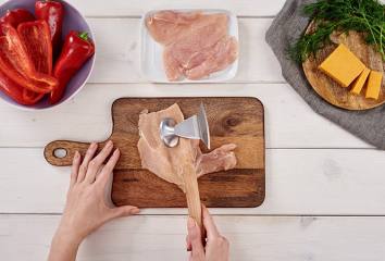 Klopfoljuk a csirkemellet kb. 3 mm vékonyra. Szórjuk meg sóval, borssal.
