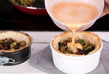 Öntsük a kész tésztára a zöldséges, utána a tojásos keveréket.