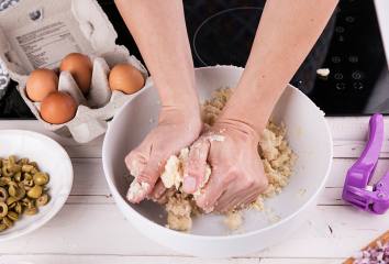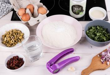 Keverjük össze egy tálkában a mandulalisztet és a sütőport, ízesítsük sóval. Adjunk hozzá kókuszolajat, vizet, tojást, majd kézzel gyúrjuk sima tésztává.