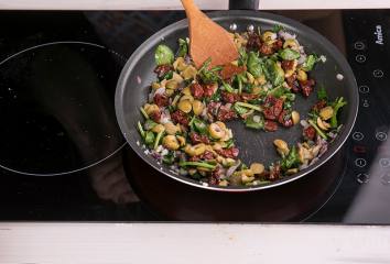 Adjuk hozzá a fokhagymát és a bébispenótot, majd kis lángon jól keverjük el benne a szárított paradicsomot és az olajbogyót.