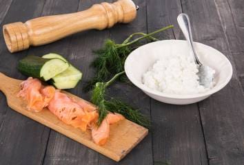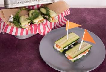 Mindegyik szeletet sózzuk ízlés szerint, kenjük meg túróval, ízesítsük kaporral.Tegyünk rá néhány szelet füstölt lazacot, majd az egészet fedjük egy újabb szelet uborkával.