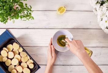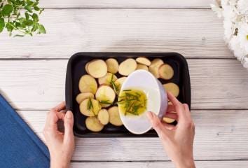 Melegítsük elő a sütőt 200 °C-ra. Mossuk meg a burgonyát és szeleteljük fel. Egy tálban keverjük össze az olívaolajat, a citrom levét, a rozmaringot, sót és fűszereket.