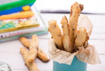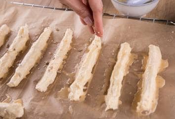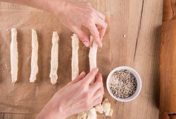 Kenjünk nyers tojásfehérjét a csíkokra, szórjuk meg szezám- vagy köménymaggal.