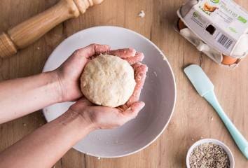 Keverjük össze a sajtot az olvasztott vajjal és egy kis sóval. A legjobb, ha a kezünket használjuk botmixer helyett.
