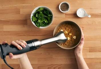 2. Az összes hozzávalót a spenót kivételével mixerben lágy, félig folyékony állagúra mixeljük. Egy kevés vizet teszünk hozzá, ha nagyon sűrű.