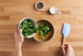 3. A spenótleveleket vékony csíkokra vágjuk és óvatosan a tésztához keverjük.