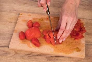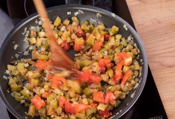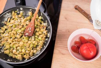 Miután meglágyult a padlizsán (kb. 3 perc alatt), keverjük hozzá a meghámozott paradicsomot és kicsit pirítsuk meg. A végén pedig jöhet a fokhagyma.