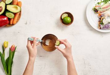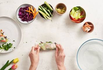 Tegyünk néhány darab zöldséget mindegyik rizspapírra, koronázzuk meg a fél salátalevelekkel és 4 szelet garnélával. Próbáljuk a hozzávalókat a rizspapír alsó harmadára tenni, minél sűrűbben, de kevés hozzávalót felhasználva. Amikor feltekerjük, hozzáadhatunk még zöldségeket.