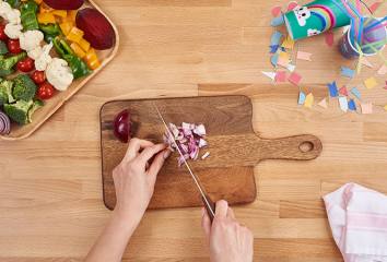 Tisztítsuk meg és vágjuk fel a zöldségeket: kockázzuk fel a paprikákat, vágjuk 4 cikkre a paradicsomokat, szedjük icipici rózsákra a brokkolit és a karfiolt, végül pedig készítsünk picike háromszögeket a céklából.